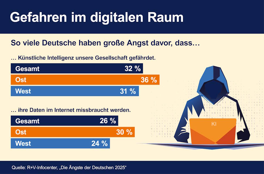 Insgesamt 32 Prozent der Deutschen befürchten, dass Künstliche Intelligenz (KI) die Gesellschaft gefährdet. Das ist ein Ergebnis der repräsentativen R+V-Studie „Die Ängste der Deutschen 2025“. Außerdem macht sich jeder vierte Befragte Sorgen, dass seine Daten im Internet missbraucht werden.