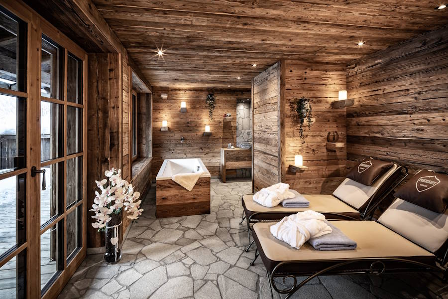 Entspannung finden Gäste des Bergdorf Prechtlgut im privaten Almspa samt Sauna, Infrarotkabine Badewanne und Hot Tub © Bergdorf Prechtlgut