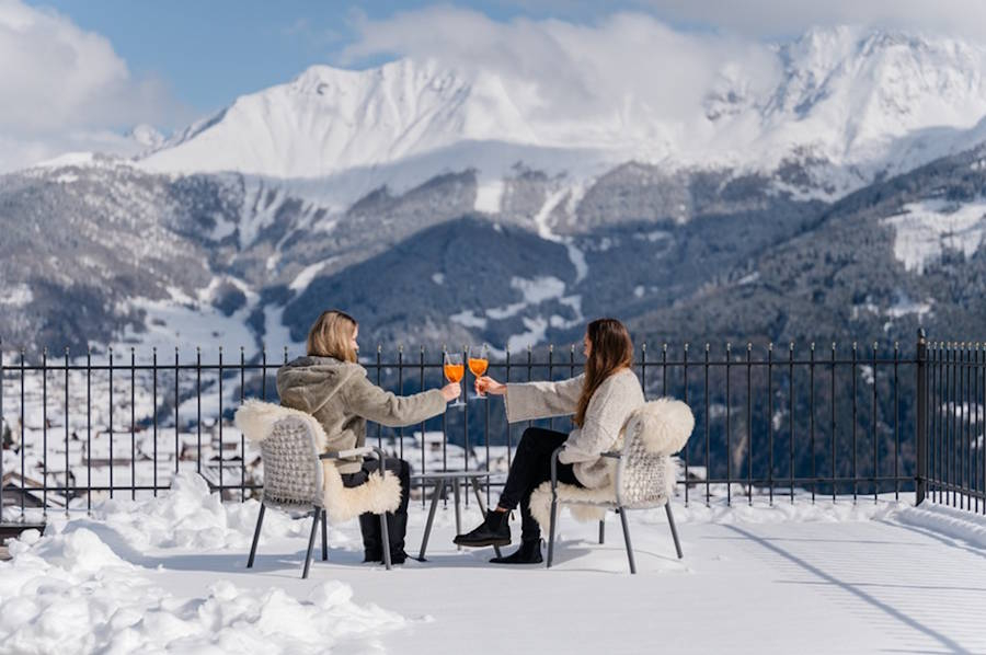Im März 2026 lädt das Schlosshotel Fiss erstmals zum stimmungsvollen DJ-Aprés-Ski auf der SHF Terrasse ein © Marika Unterladstätter