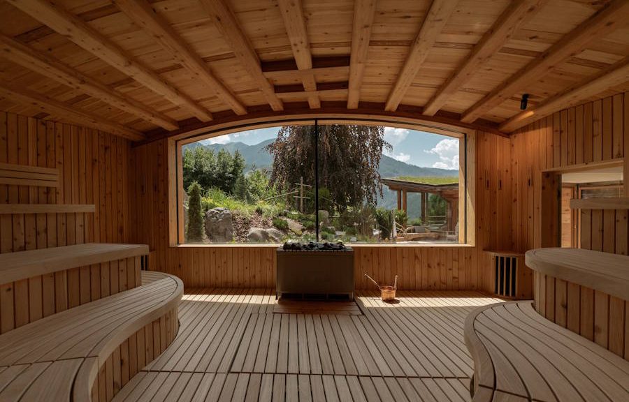 In der großzügigen Ritualsauna inklusive energiesparendem Sauna-Ofen finden auch die täglichen Aufgussrituale statt © Upscale Natürlich, nachhaltig, neu Mit einem wegweisenden Architekturkonzept aus…